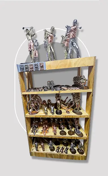 Shelfing and stock of bronzed products are available for stores to sell. This system allows stores to expand their product range without purchasing inventory upfront; stock is loaned, and payment is made only after a sale occurs. The store receives a negotiated portion of the profit before stock is provided.